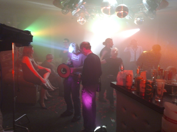 Das Hobbygott SPOTLIGHT Musikvideo im Moulin Rouge, Wien. In der Mitte Michael Rottmann (Kamera-Operator) mit dem vor der Optik angebrachten Ringlicht. Hinten im Profil: Irfan Rehman.