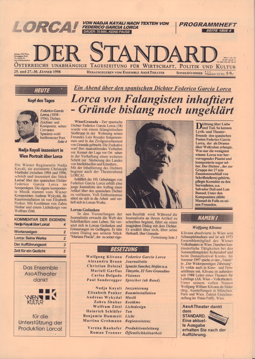 Wien/Granada - Der spanische Dichter Federico Garcia Lorca (38) wurde von einem falangistischen Stoßtrupp in der Wohnung seines Freundes Luis Rosales festgenommen und in das Zivilgouvernement von Granada gebracht. Die Exekutive warf ihm staatsstörendes Verhalten vor. Kenner der Lage vor Ort sahen in der Verhaftung einen weiteren Schritt zur Säuberung des Landes von Intellektuellen und Künstlern. Mit der Inhaftierung des Dichters beginnt auch der Theaterabend "LORCA!".