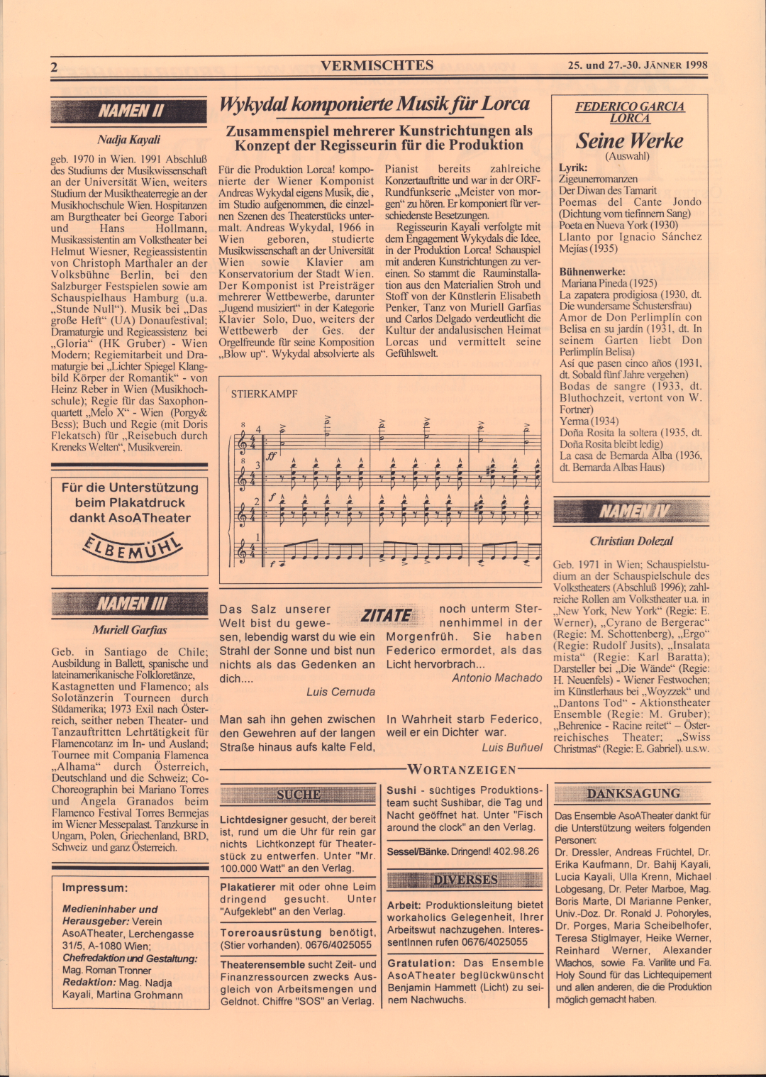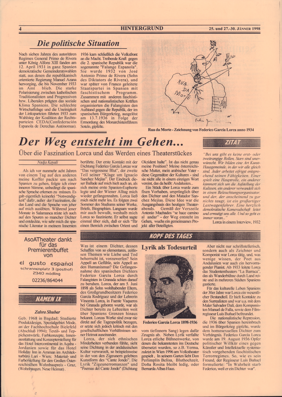 Als ich vor nunmehr acht Jahren von einem Tag auf den anderen meine Koffer packte, um nach Spanien zu gehen, folgte ich einer inneren Stimme, die mich drängte, die spanische Sprache zu erlernen. Es gab eigentlich keinerlei "Notwendigkeit" dafür, außer der Faszination, die das Land und die Sprache von jeher auf mich ausübten. Während jener Monate in Salamanca wandelte ich auf den Spuren so mancher Dichter und entdeckte, wie sehr mich die spanische Literatur in meinem Innersten berührte. Der erste Kontakt mit der Dichtung Federico Garcia Lorcas war "Das vergossene Blut", der zweite Teil seiner "Klage um Ignacio Sanchez Mejias". Der Eindruck dieser Ballade auf mich hielt auch an, als sich meine erste Spanien-Euphorie legte und der Wiener Alltag mich wieder gefangennahm. Lorca ließ mich nicht mehr los. Es folgten zwei Sommer des Eintauchens in seine Werke, Briefe und Biographien. Langsam wurde mir auch bewusst, weshalb mich Lorca so faszinierte. Er selbst sagte einmal über sich, dass er sich "für einen Bereich zwischen Orient und Okzident halte. Ist das nicht genau meine Position? Meine österreichische Mutter, mein arabischer Vater - diese Gegensätze der Kulturen - sind sie nicht alle in einem einzigen Wort vereint, das da heißt: Andalusien ... Ein Stück über Lorca wurde zum fixen Vorhaben, ursprünglich über den Dichter und den Matador Sanchez Mejias. Diese Idee war die Ausgangsbasis des heutigen Theaterabends. Gemäß der Verszeile Antonio Machados 'se hace camino al andar' - der Weg entsteht im Gehen, wuchs ein gemeinsames Projekt aller Beteiligten.